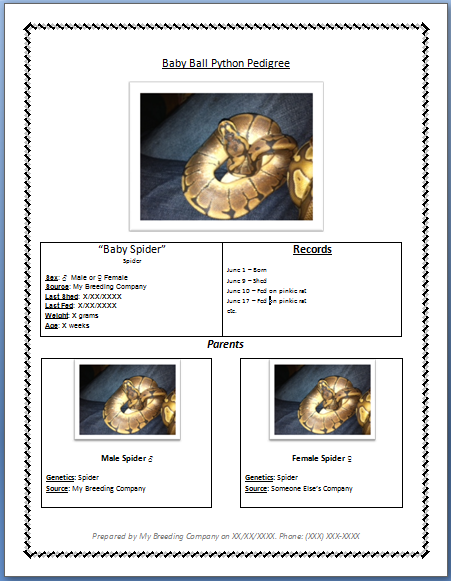 I've been playing around in Microsoft Word to make up a pedigree template of sorts for my snakes. I plan on breeding them (far) in the future, so I thought it'd be cool to include a little sheet like this.