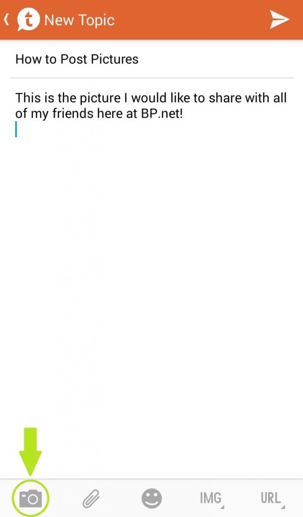 4. Title your new thread and create the body of your post. When you've reached the spot in your post that you would like to insert a picture, select the camera icon from the bottom of the screen: