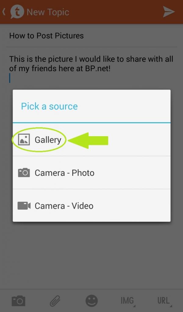 5. The camera icon brings up a menu for you to choose the source of your picture. Since I have the picture I want to share saved on the phone already, I chose the "Gallery" option: