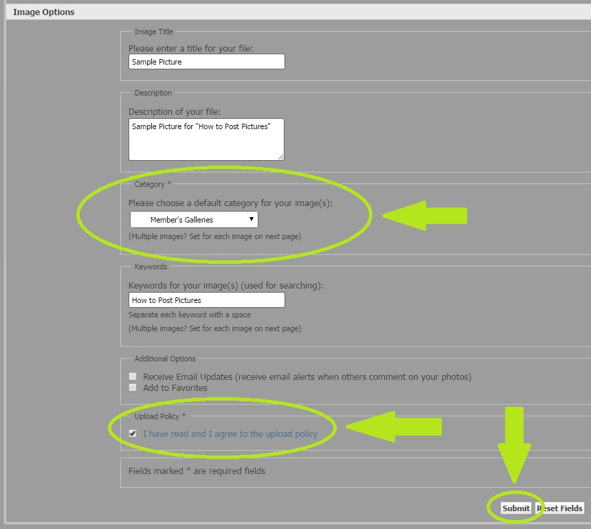 6. From there, enter any information that you wish to add about your picture and select the "Submit" button. Remember, the fields marked with the * are required: