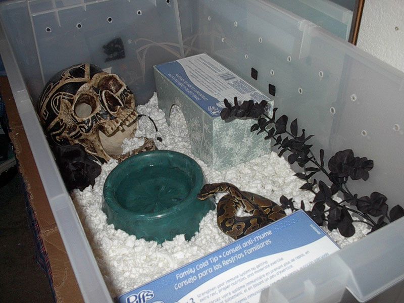 Then I set him in, and he got exploring which he's been doing ever since! I'm a little worried those hides might be a bit big for him, but I'll get him something better soon. The bowl is a hand-me-down from Cleo, and the skull... well, it's just a fancy shed-aid. He seems to think it feels cool, he's been exploring that the most but I couldn't really get good pics through the plastic and I'm trying to let him be... trying REALLY HARD.