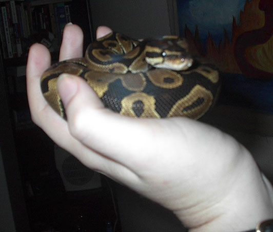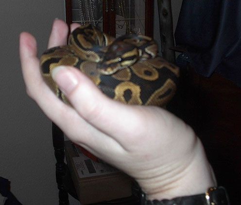 Sorry about the fuzziness of the pics, my camera is on crack and has focus problems. First he sat in my hand warming up while I obsessed/fussed over his enclosure temp a bit more. Snakes always dig my watch, lol.