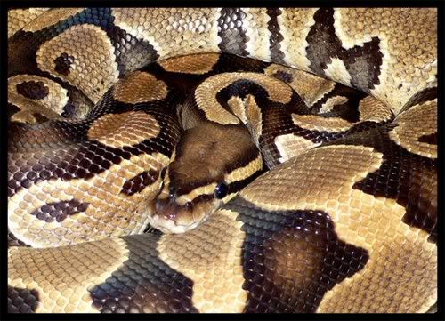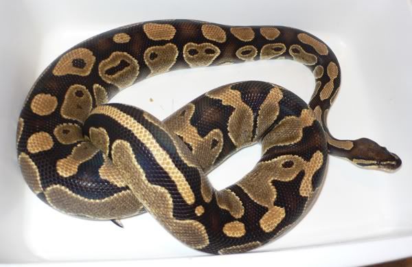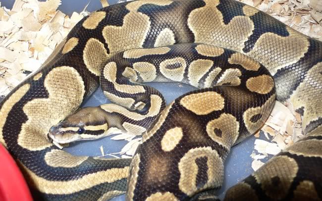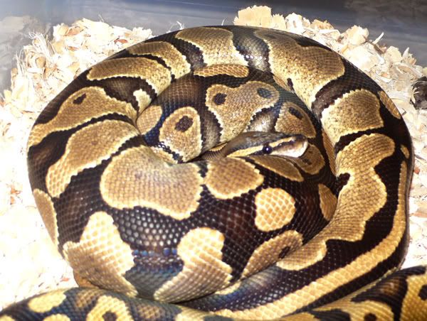 Gideon and Daiser are two my favorite ball pythons. Daiserbeam was our first adult normal (and I think our prettiest normal, but don't tell the others) and Gideon... Well... Once I saw Gideon, I HAD to have him. He's a yellowbelly, and possibly a fire. I purchased him through a broker, and he originally came from Ian G, was sold to somebody else, and eventually made his way to the broker. By then there were some misplaced records, and it was unclear whether he came from the yellowbelly clutch or the yellowbelly/fire clutch. He's most likely "just" a yellowbelly, and he's just GORGEOUS. Of course, I am a bit biased.
