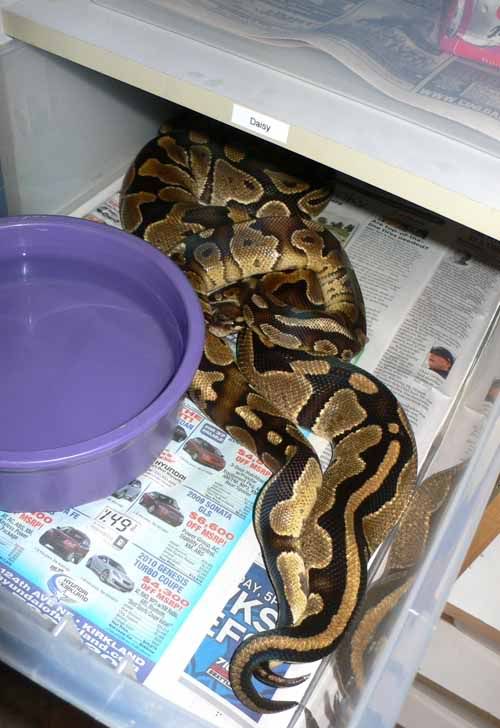 Imagine my surprise when I walked into the reptile room this morning, found Gideon's tub empty (THAT gets your heart racing!) and then found THIS in Daiserbeam's tub: