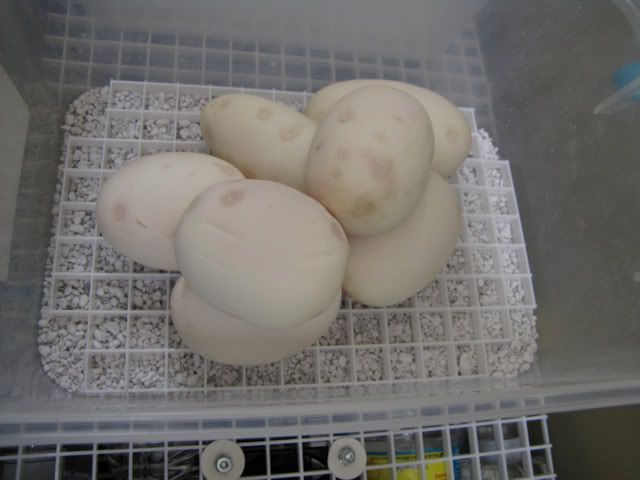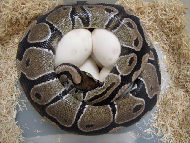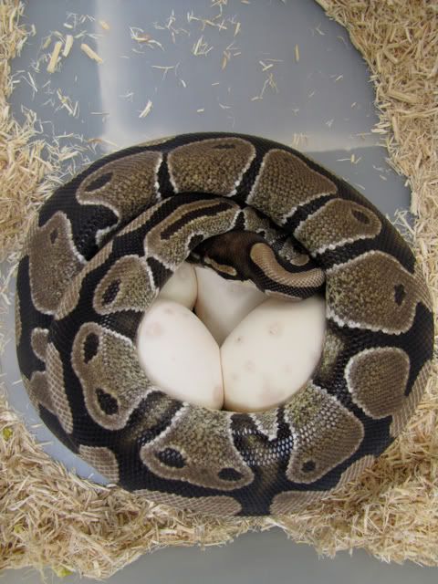 Well today my female decided to finally lay! She laid on her 28th day. she laid 7 eggs. Before breeding she was at 1600 grams. She was bred to both my Mojave male and my spider male. Here are some pictures.