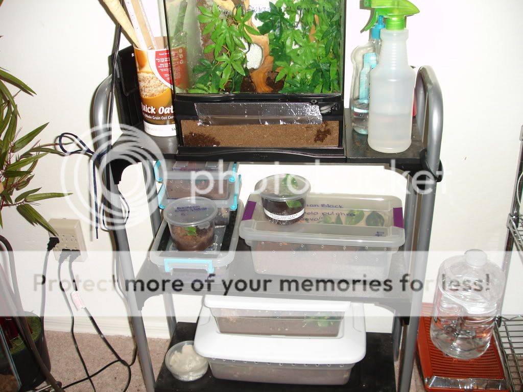 My Tarantula Stand -- On top: A. avic female | In middle: O. wahlbergii, G. rosea, N. coloratovillosum, G. pulchra female, G. pulchripes, P. irminia | On bottom: B. smithi female and G. pulchripes female