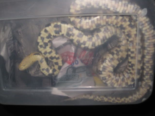 I'll work on it. The head was what threw me off. It's more or less solid colored, his eyes are yellow, not sure that means anything. Gosh dang it, figures he's a wild snake. At least he won't get murdered by people that are freaked out. I'll take him far out of town tomorrow morning and let him loose.