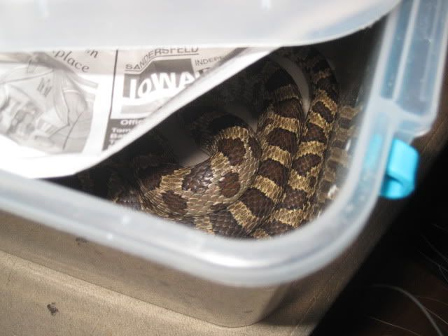I got a call that there was a snake up at the library in town. I was out riding my motorcycle and just stopped by thinking it was going to be a bull snake or some other obviously native Iowan snake. Well, I find what I thought was a corn snake, which should not be loose in Iowa. I bring him back home and look up pictures of native snakes and find the fox snake is pretty darn similar. If he's a wild snake I'm going to freak out a little, I don't just go picking up wild snakes, and he was very calm and in perfect condition!