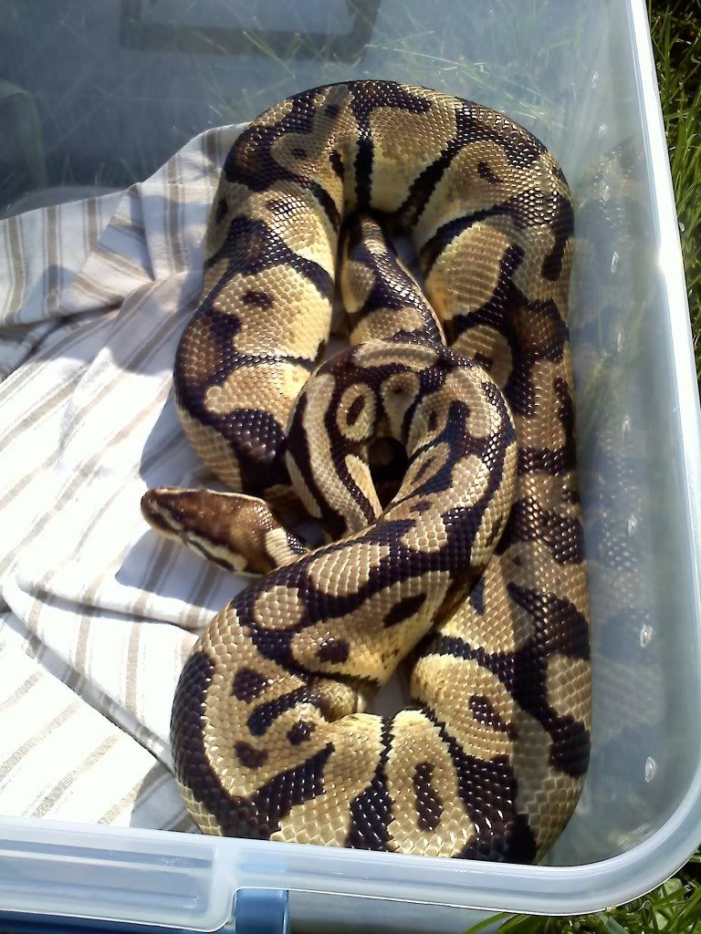Alright so we just got back from the reptile show here. I was bummed there wasn't as much as last year, but it was still nice. I picked up a 2010 pastel female and a 2011 het pied male. My husband who could care less about my snakes(border line scared of them) is checking things out after walking around a bit, and decided he liked a 2009(I believe) pastel male! I asked if I could take a look at him real quick at which point I think hubby was hoping I would say no. He started asking what I thought of him and such for the price. I told him that it's a nice snake, with good size, and is probably as browned out as it will get(correct me if I'm wrong). I told him if he wanted him it was all on him. Oh and he had to at least touch it first. Needless to say he got it, and is now in love! Obviously he doesn't understand how addicting these guys are yet..... Photos to come in a bit.