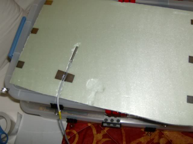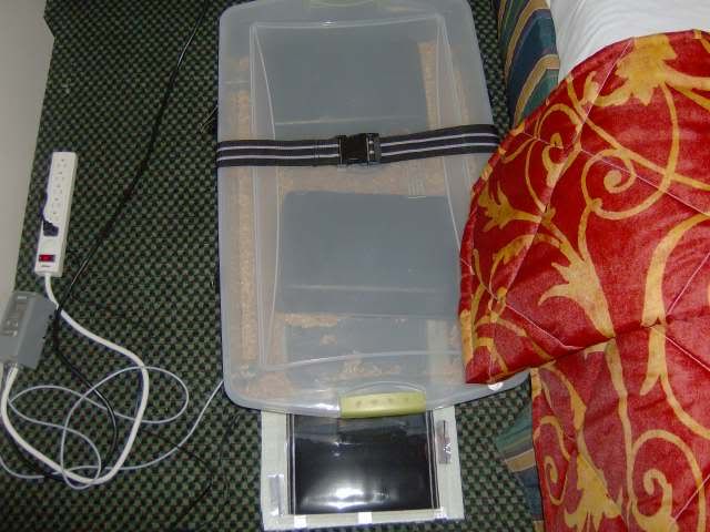 And here are a couple of photos of how I do it using polystyrene insulation. You can use a screwdriver or something to press an indention into it for the probe to lay in, tape the UTH over that, then set the enclosure on it.