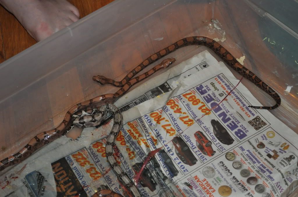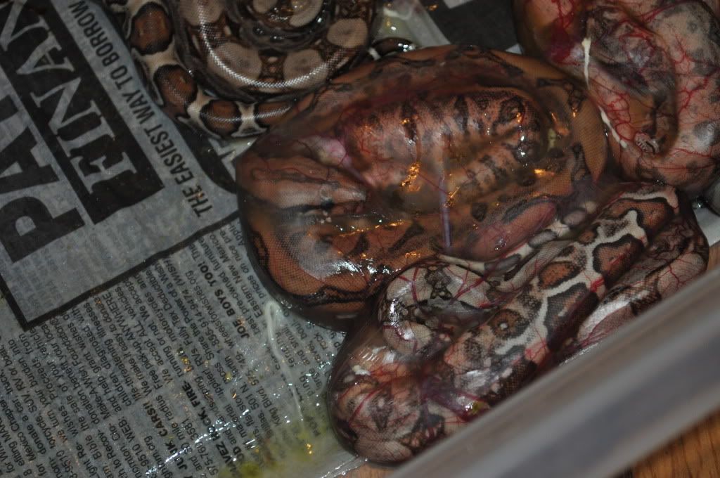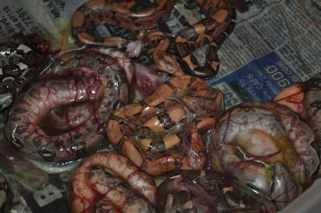 So I have been impatiently waiting on this female boa to pop.... She was due by my count on the 06-13... well tonight was day 139 and she popped......14 babies all seem to be doing well... pairing was DH pewter x dh pewter..... So far my count is 5 bloods, unsure on type2 anery or pewters either one, but 9 babies still in sacks and well bloods are easy to identify.... Any way no one here wants to read lets see some pics