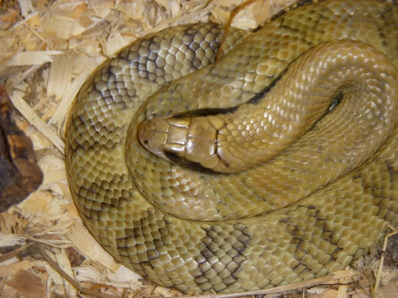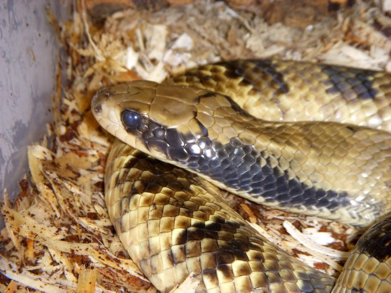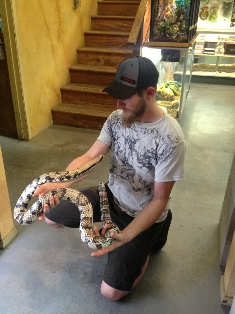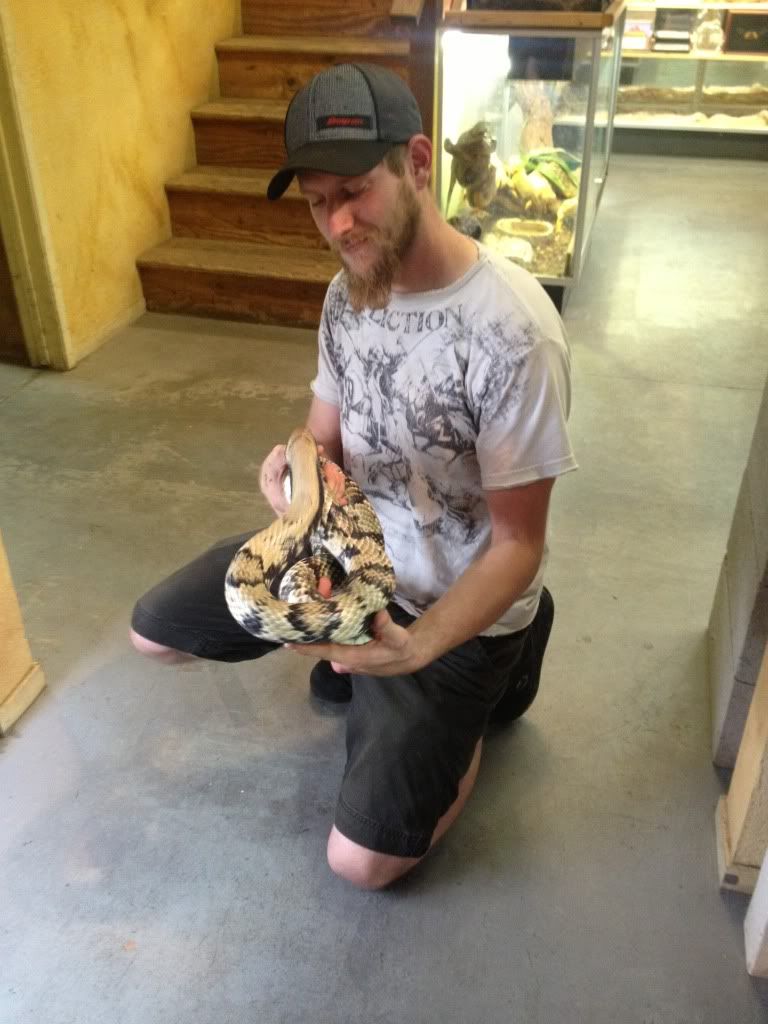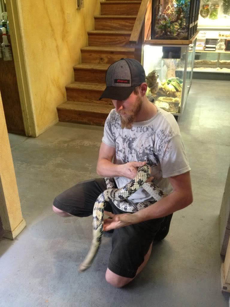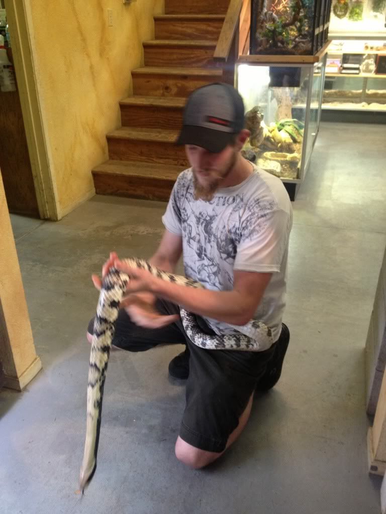So I was at a local breeder/store picking up my 1.1 Adult Yellow Anaconda pair when I inquired about False Water Cobras. The store owner took me into the breeding room and showed me some of his hypo hatchlings. They were impressive. I had some questions about handling and how they handled their falsies, so he brought me over to a large female that he raised from a hatchling. After about 20-30 mins of discussion and him handling her this happened...