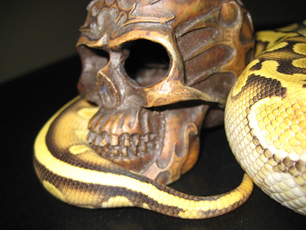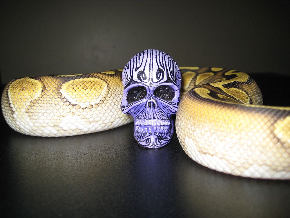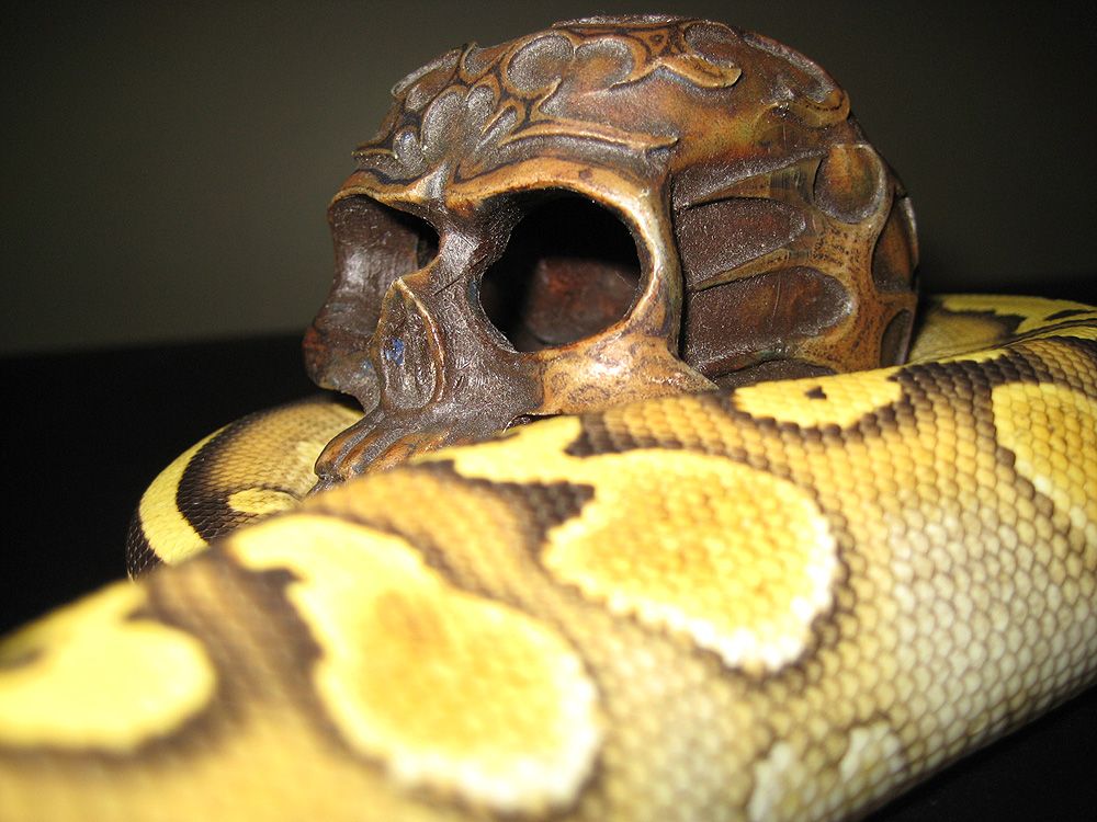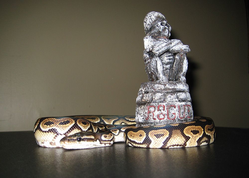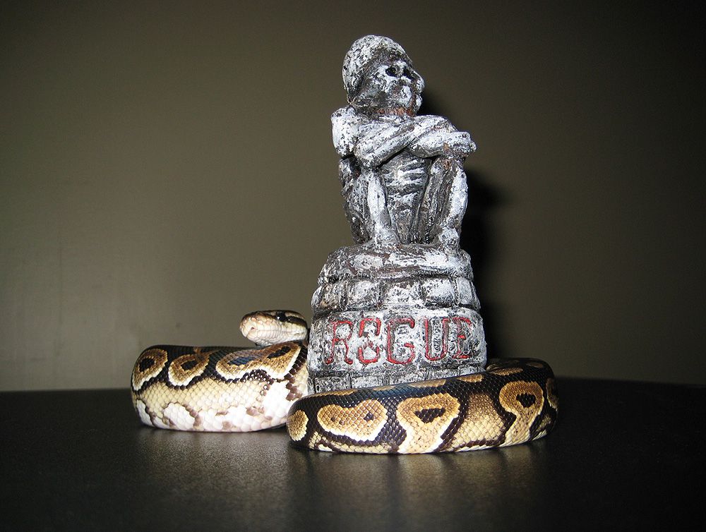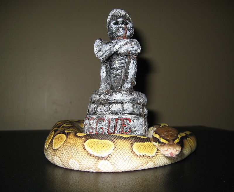 I made him out of Sculpey...was gonna put him in the oven to bake but got drunk instead and threw him into the fire pit in the back yard. Dug him out a few days later and thought he looked cool. Hit him with some white and red paint, and tada!