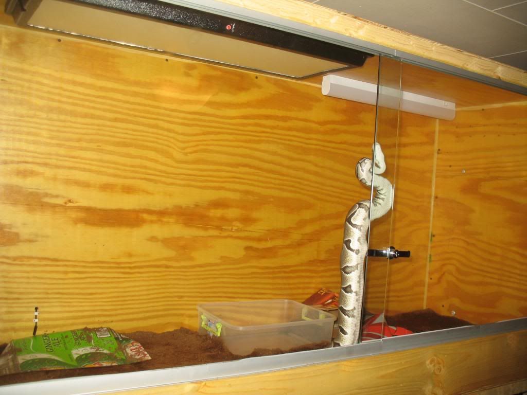 Bud climbing up the doors. The enclosure is looking a bit under-decorated because it was during the time I was experimenting to see how much decoration was best. I eventually got it to 8-9 hides (there were about 4 or 5 when this photo was taken but you can only see 2) and that seemed perfect for him.