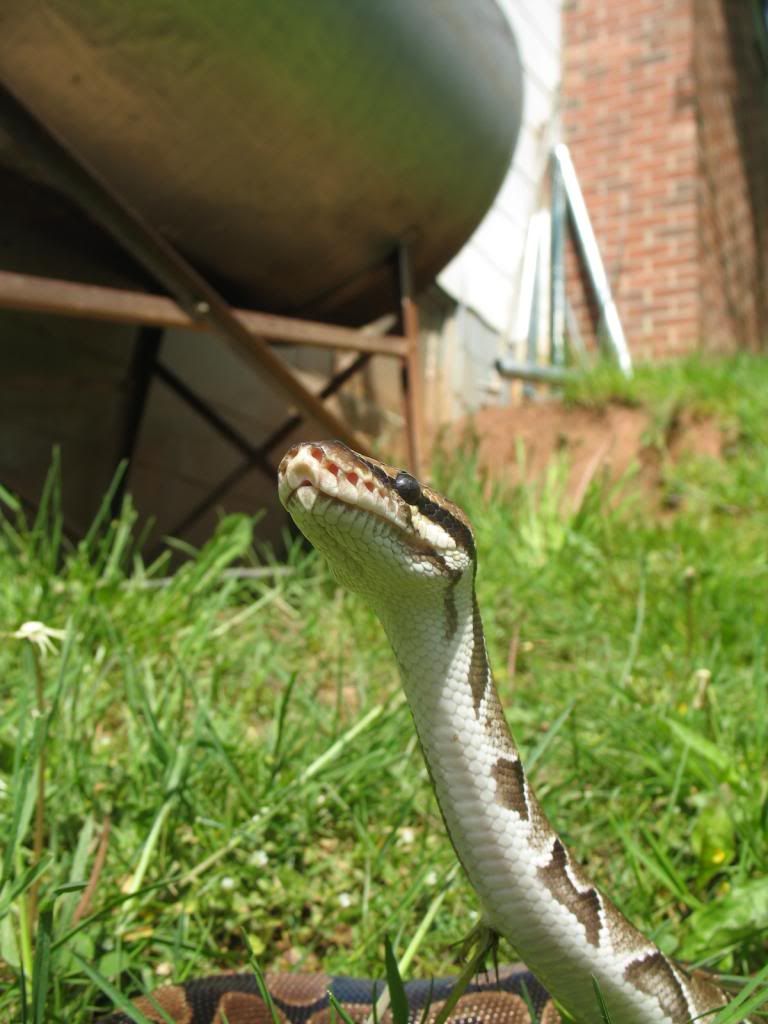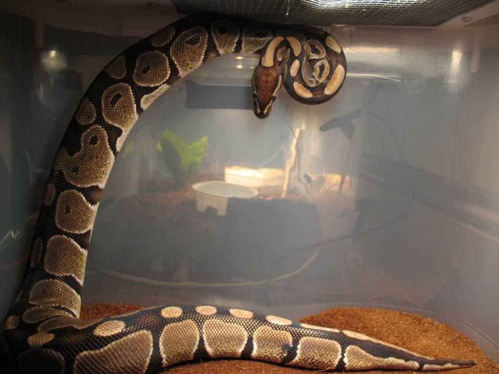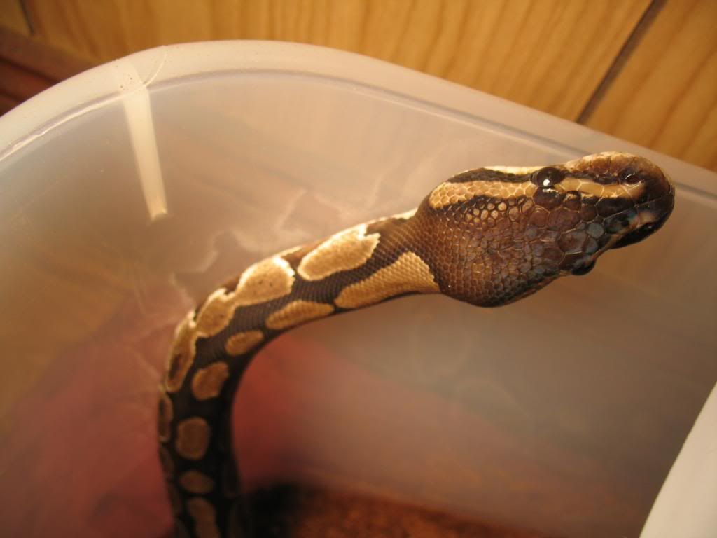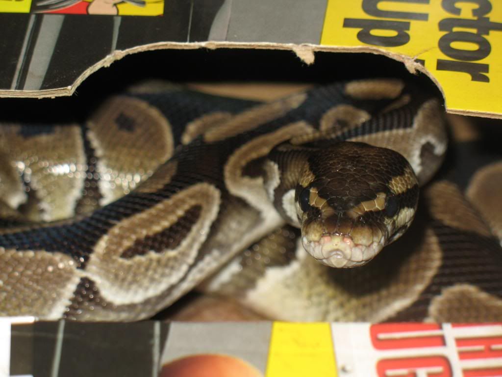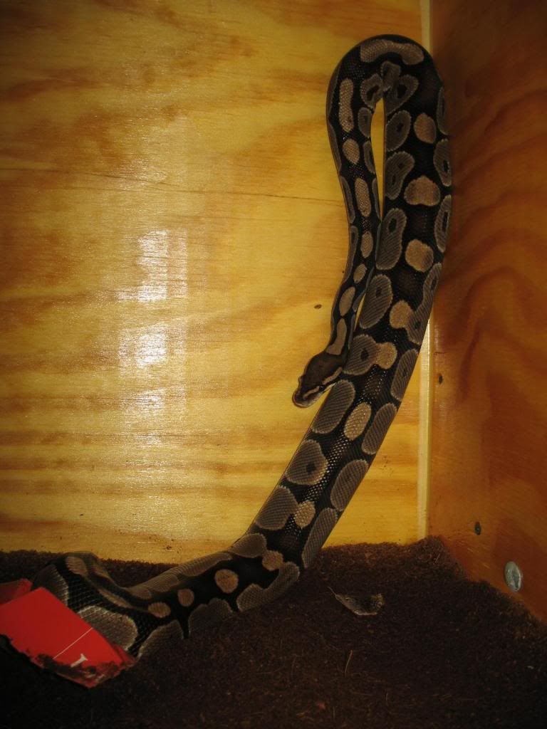 Bud is my 7 year old, 3.5ft ball python. I got Bud on September 23 2006, as my late 12th birthday present. Unfortunately, me being 12 and my father being ignorant on the care of animals, his care was less than satisfactory. Luckily, the physical problems were limited to bad sheds and winter fasts. Outside of the winter, he was a pig despite being so exposed in his enclosure and was probably a bit chubbier than he needed to be now that I know more about snake care. In 2011 I decided I wanted to get another snake, but I wanted to step up in size and get a slightly large snake. It was during my research on the care of boas (I was now almost 16 and so I was a bit smarter and figured I should probably research) that I decided to look at the care of ball pythons as well, because so far snake care in general was a whole lot different than what my father taught me when I got Bud. I very quickly implemented changes in his enclosure. Before, I had this treated wooden hide that had a heat lamp that was screwed to it, which was a major burn hazard. I took it off of the hide and lifted it to the top of enclosure, which was 3-3.5ft tall (I'm not sure of the measurements anymore as it's since been destroyed) so that he could not get to it. I was using ReptiBark, which didn't hold humidity good enough so I switched to EcoEarth. After just two sheds, his spotty scales went away (ones that looked dried out and stood out as white against the rest of his scales) and his discoloration went away to show this beautiful snake I never even knew existed. His first shed was still a little spotty, but his second one came off all in one piece including eye caps. I'd spent years gently rubbing stuck sheds off with a wet wash cloth and holding wet cloths to his eyes to gently remove stuck eye caps without any knowledge that snakes should shed whole pieces, so that I thought it was normal. Because of the extended period of bad sheds and poor humidity, a few of his scales (just one or two) have completely lost pigmentation and some of his scales are deformed, unfortunately. I'm lucky he didn't get an RI because other than one heat lamp, he had no other heating elements. I suppose this is thanks to our wood stove, which must have kept his enclosure just warm enough.