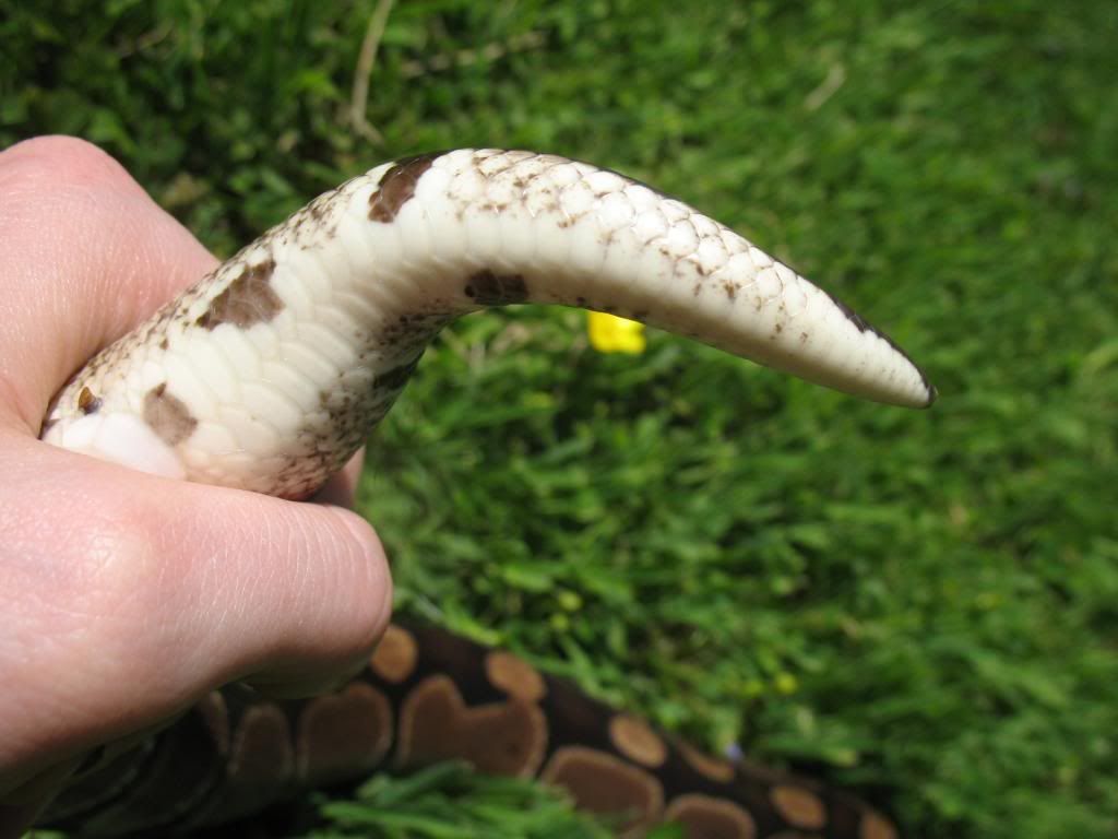 He looks so sweet! My ball python, Cave sometimes does tail first. Which gets annoying when he does. xD