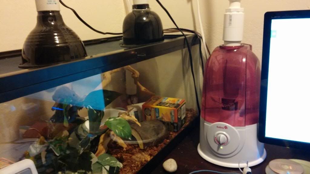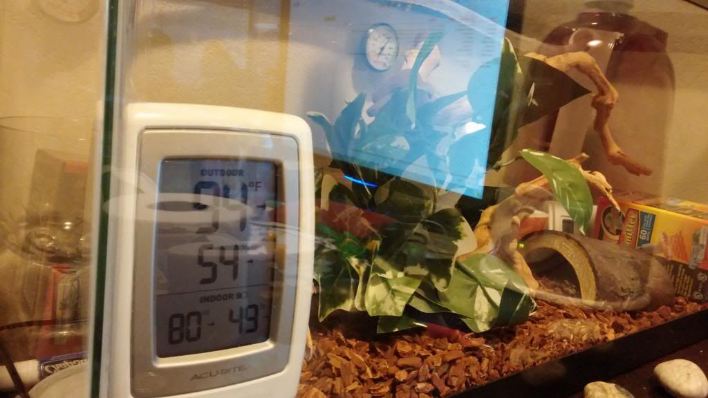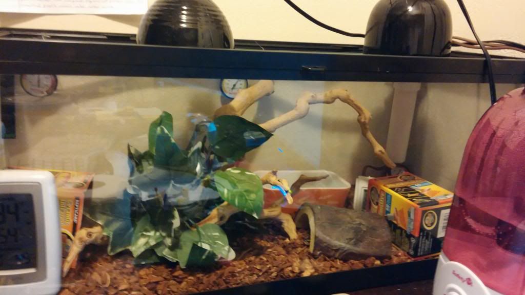 Looking for criticims, questions, comments. What do you guys think. Two ceramic lamps and UTH controlled by thermostat with both digital and analog thermometers and hydrometers. Reptibark substrate, cardboard boxes, and wooden hides, homemade styrafoam and plastic tree. I made a custom humidifer that I can remove to clean.