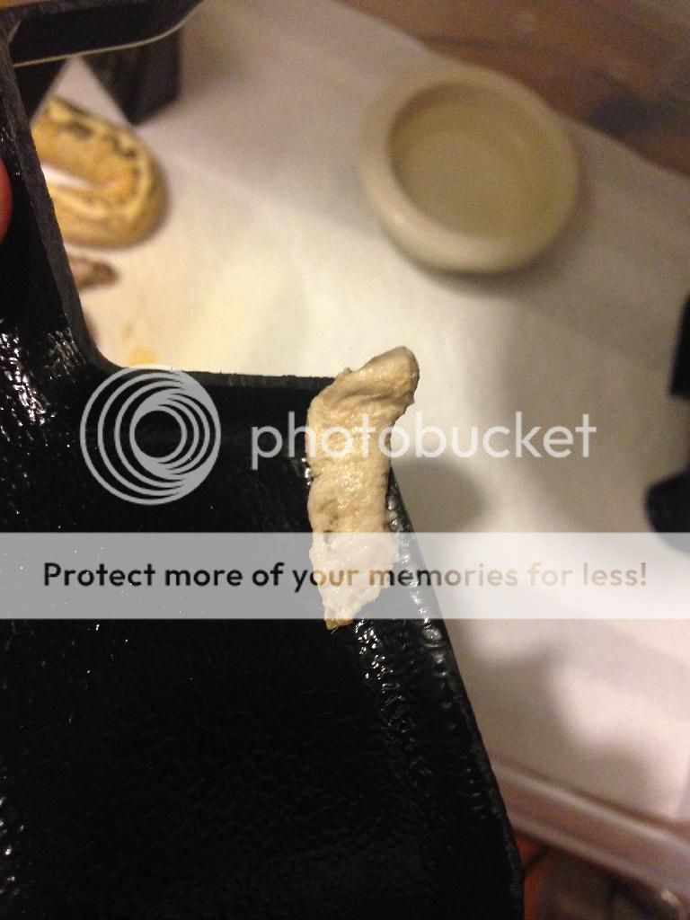 I have a question about my vanilla cream I purchased about a month ago. I looked in her tub last week and found some poop dried up and it looked kind of hairy. Tonight I looked in it again and found the same thing except it was fresh and I took a picture. Just wondering if it looks normal to you guys? This is my third ballpython but I haven't seen anything like it, it sort of looks like white clay. I bought her and 5 days later she ate a f/t rat pup 5 days after ate another one. The past two feedings she did not eat. I had her on aspen originally and after the second feeding I switched to paper towels. She's in a tub with a uth temps are about 90-91 hot and range from high 70s low 80s cool side.