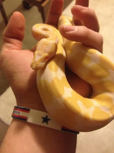 She's an Albino, eats all the time and is growing fast, very friendly. I'm new to the python and snake community altogether, but im loving it so far.