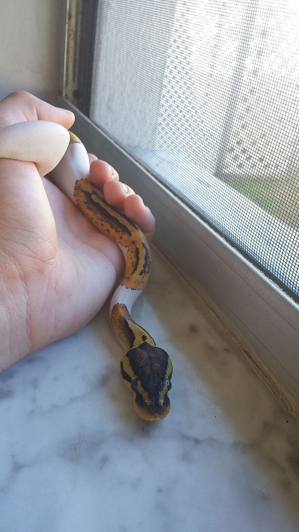 Snapped a couple pictures of Cleo, my pastel piebald girl. I'm truly loving this little girl more and more everyday. She's made such a transformation since I've gotten her a couple months back. Her shipping was extra stressful as the FedEx worker at the ship center I had her held at for me literally just tossed the box she was in on the counter, despite it saying live animal all over, all the while complaining about how she was supposed to be on break. Ugh. So straight from the box she was super shy, super stressed and by far the tiniest snake I'd ever bought. I think she was a whopping 68 grams. I was so worried she wouldn't eat because of the circumstances but nope, she by far my best eater and at almost 200 grams right now. Not only that, but she's by far my most friendly and curious snake. I just adore her.