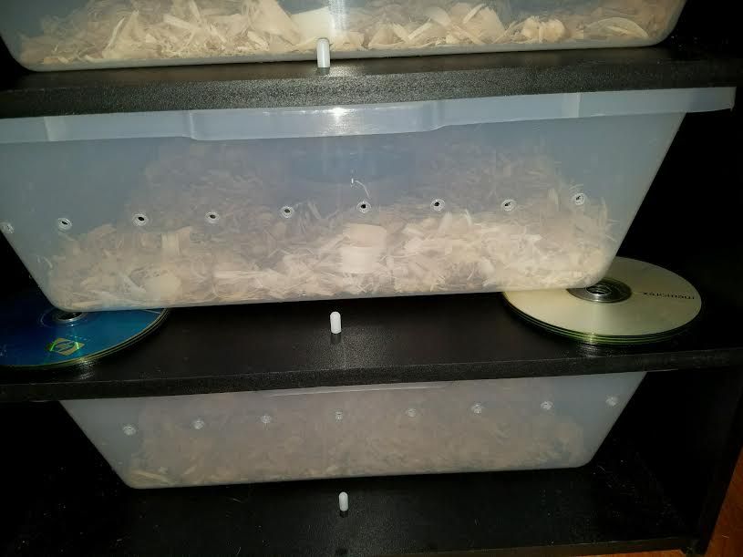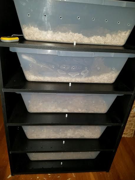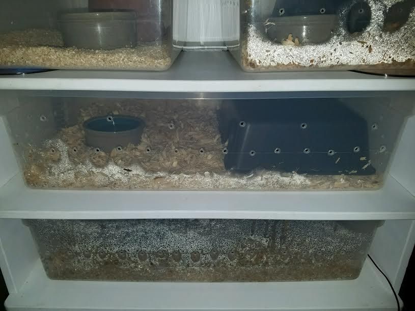 This happened in a 10 hour window, I was in my Lady Cave the night before. I was completely confused when I went into the room, and found the drawers open. I found her sitting on the heat tape, behind the tubs, a shelf higher in the AP rack. She had pushed open two 15 quart tubs. I found the male on the heat tape in her in her drawer, behind her tub.