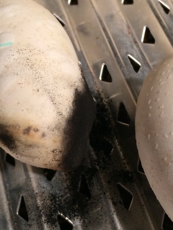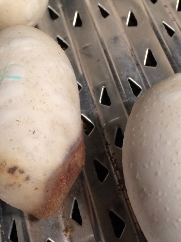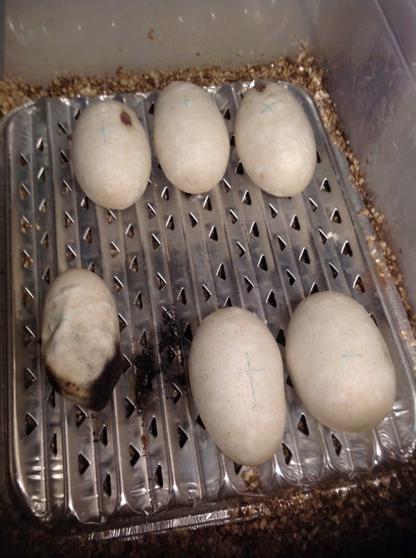 After 3 weeks of incubation I controlled them and I found one egg a bit collapsed with mildew on. The problem was that side of the egg touched the wet box wall. I thought I can give a chance for the little one, so I replaced in the box, brushed off most of the mildew and powdered the critical part with activated carbon powder.