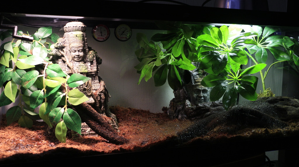 First I got everything for my 20 gal. terrarium, still waiting for my herpkeeper pro. Set it up, and played with temp and humidity until everything was perfect. Temps going from 93 to 75 from hot to cold side, humidity on 55% to 66%.