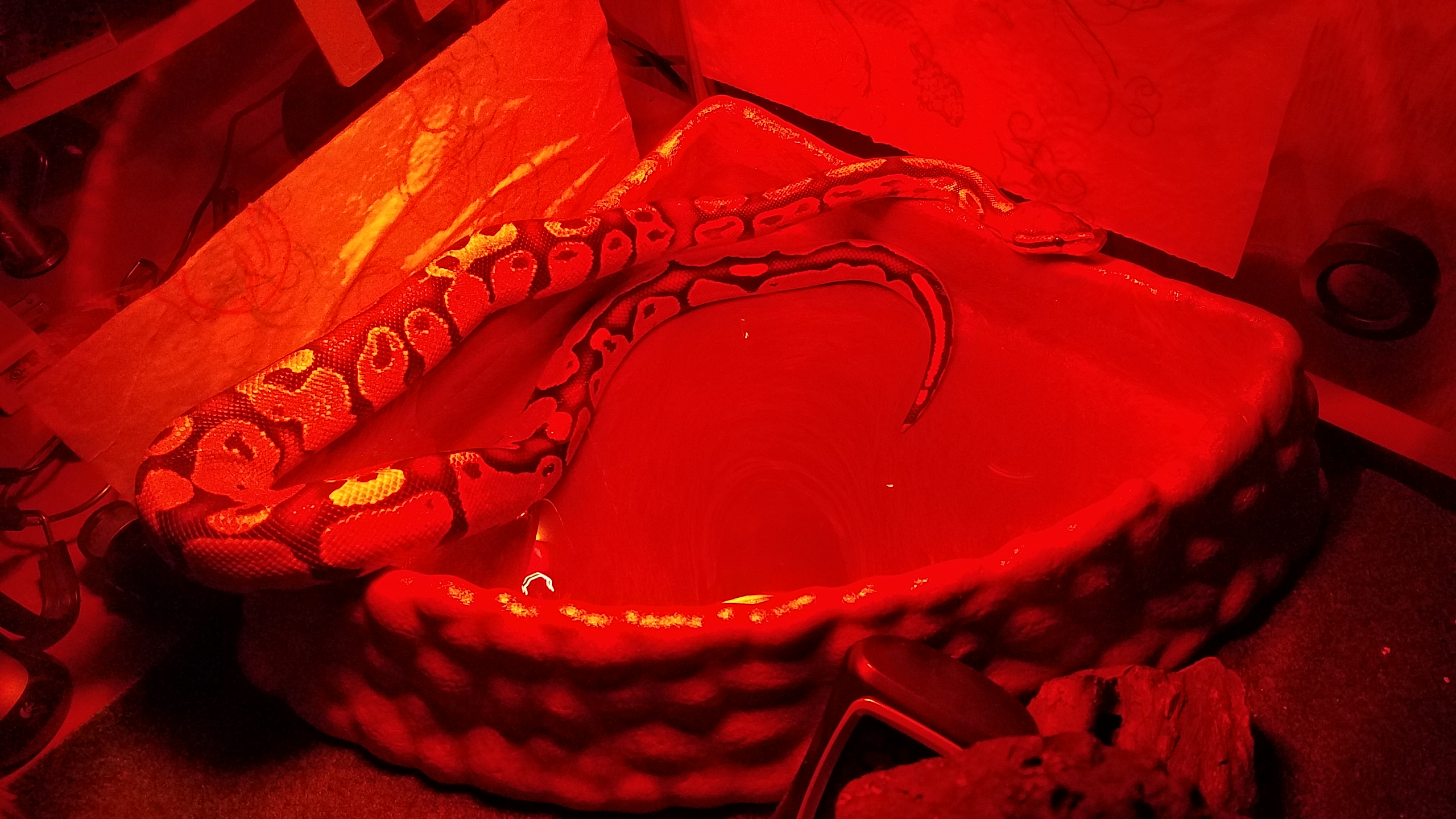 tank specs: He's in a 50 gallon tank with a heat mat underneath 1/3rd of the left side. and 2 night time heat lamps overhead of that spot a 100 watt and a 50 watt bulp. the 50 is in case the room gets too cold (the room he's in is VERY, unavoidably cold, unfortunately) that's why the water is in between those two, It's lukewarm but definitely cooler than the outside air so he can chill in it. Plus he has the other third of the tank which is much colder. it's 75°f where his hiding rock is, in the center of the tank. inside the rock is like 80°f and that's where he seems to chill for the most part. prolly cause it's the warmest spot.
