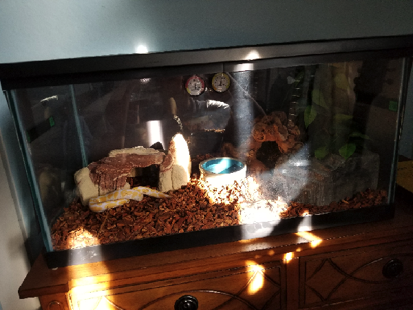 Also, I added a 5 foot long vine with many leaves to his tank. It offers him constant cover while moving from hide to water or whatever else he enjoys to do. :) I also took his green leaves and moved them so they hang over his cool hide entry, as he loves it in there and I feel bad he can see me when I come into my room or what have you.