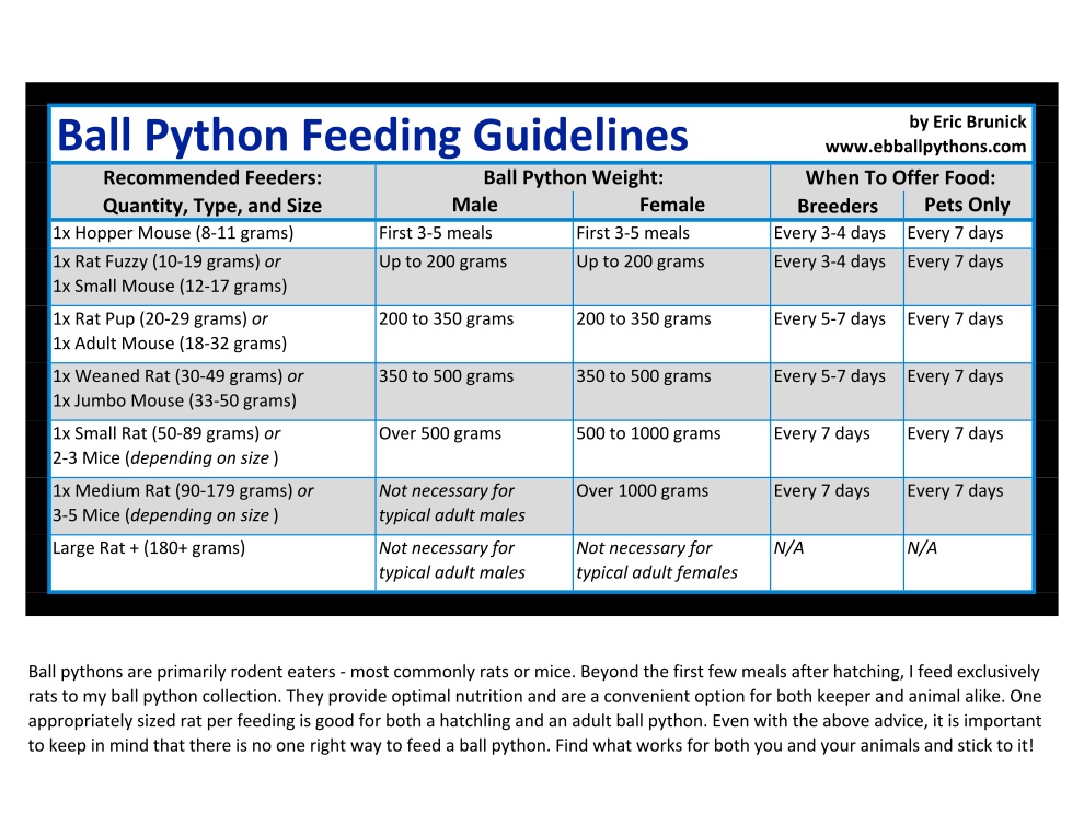 As for the feeding, there's a pretty common feeding chart a lot of people on here (myself included) follow https://ball-pythons.net/forums/cach...fdf2531721.jpg Now you don't really HAVE TO use this, so if you don't want to, a good rule of thumb would be to go for a prey with the same thickness as the thickest part of the snake's body.