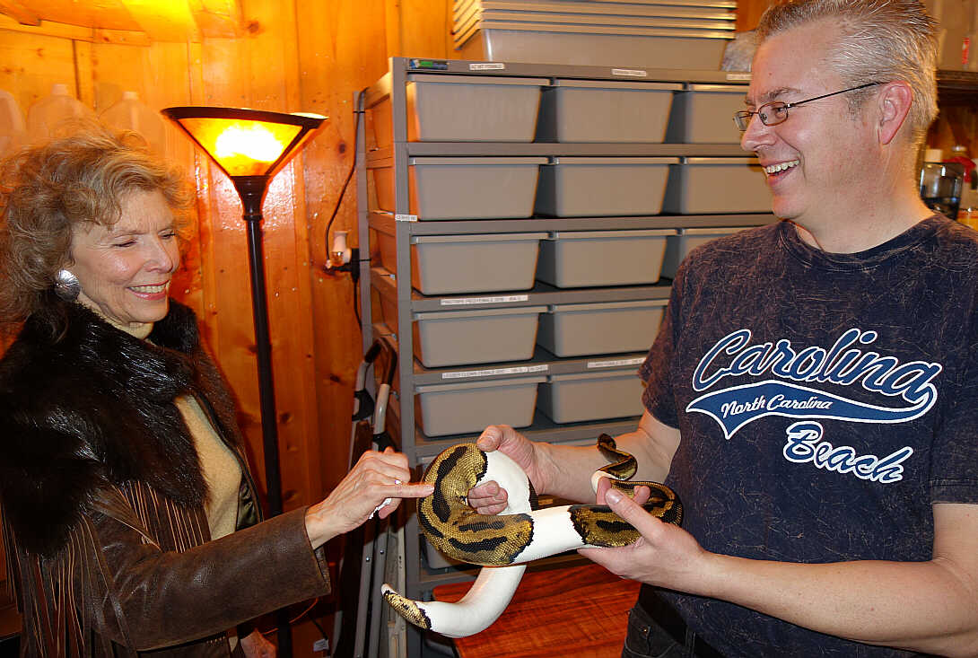 I always have new visitors over to see my collection of snakes and its always interesting to get non-snake people in to hear what they have to say about them. I had this couple over from church, neither one had experience with snakes. I got Jim to hold a ball python, he was surprised how soft and velvety it felt. I couldn't get Sharon to hold one, but as I was going through tubs and taking out snakes to hold them and show them off she was surprised that I wasn't getting bit and asked if they ever bit me or if they didn't bite because they knew me. They heard that I had a snake and wanted to see it, boy were they surprised when I showed them a whole collection! It was an amazing encounter!