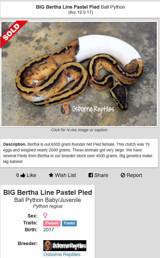 I was just browsing through the ball pythons on Morphmarket and clicked on this pied female. Apparently it came from a female pied that weighs 6500 grams. She laid 19 eggs and the clutch of eggs weighed 2000 grams! This is by far the biggest ball python I've ever heard of, very unusual for a pied too. They are calling it their 'Big Bertha' line.
