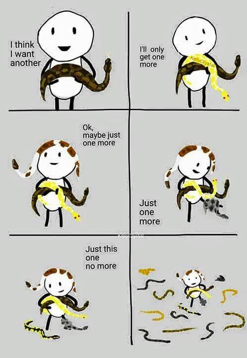 So when I bought my first snake I said just 2. Then it went to 4. Now I just got my 1nd and I'm already thinking of the next one. Dont get me wrong I'm happy with what I have, but there's so many cool species!!!!