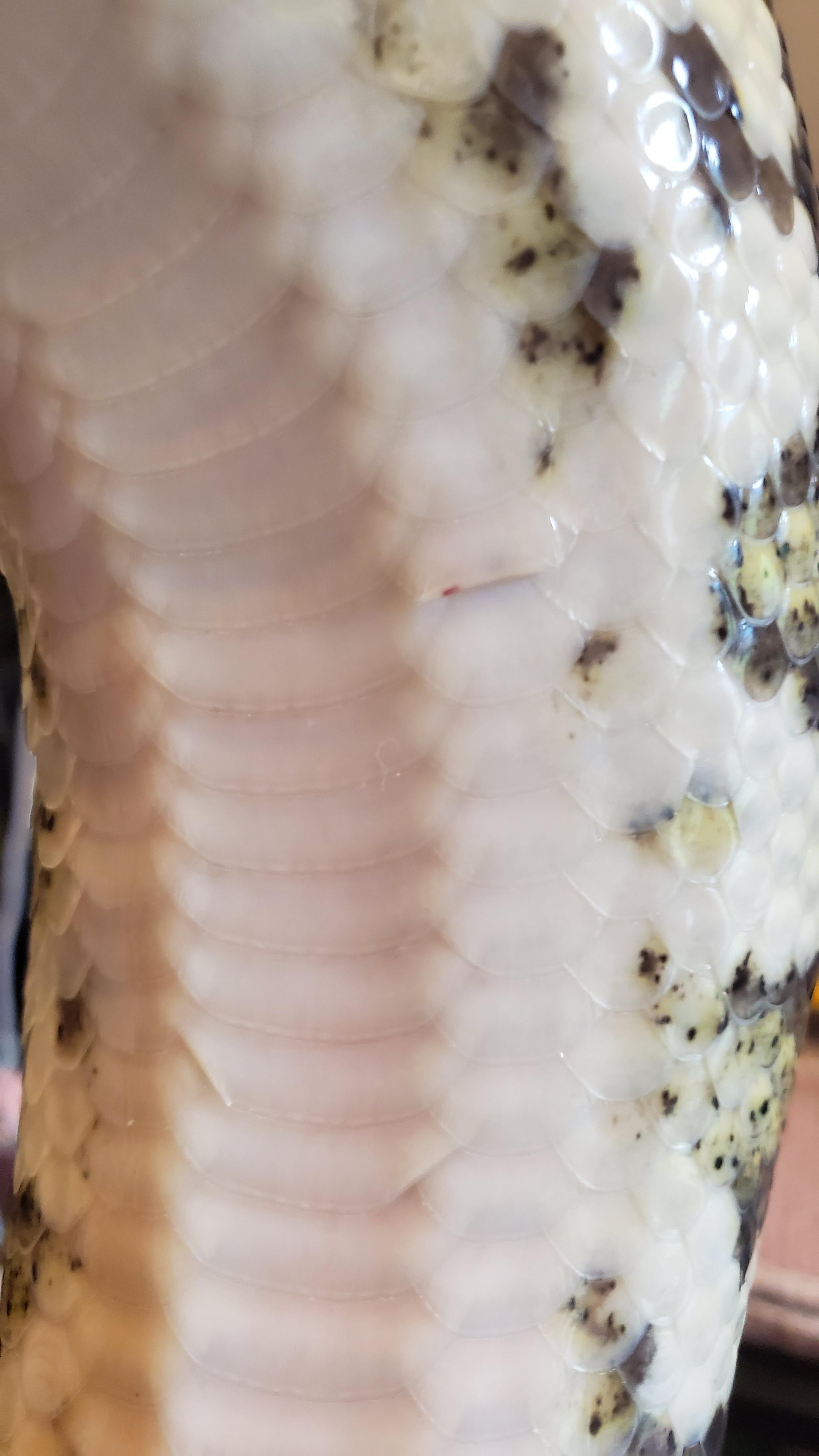 Okay... I'm sure this is just one of those "it's fine, it'll fix itself next time he sheds" things but I'm worried so I'm posting anyway lol. My BP has been showing me signs that he's about to shed for about a week now (very dull, pink belly) but is still yet to actually shed. He hasn't eaten in 2 weeks because I didn't want to feed him while he was in shed, especially since I'm going to be attempting to up his meal size this feeding. I took him out quickly today just to check on him since he hasn't shed yet.