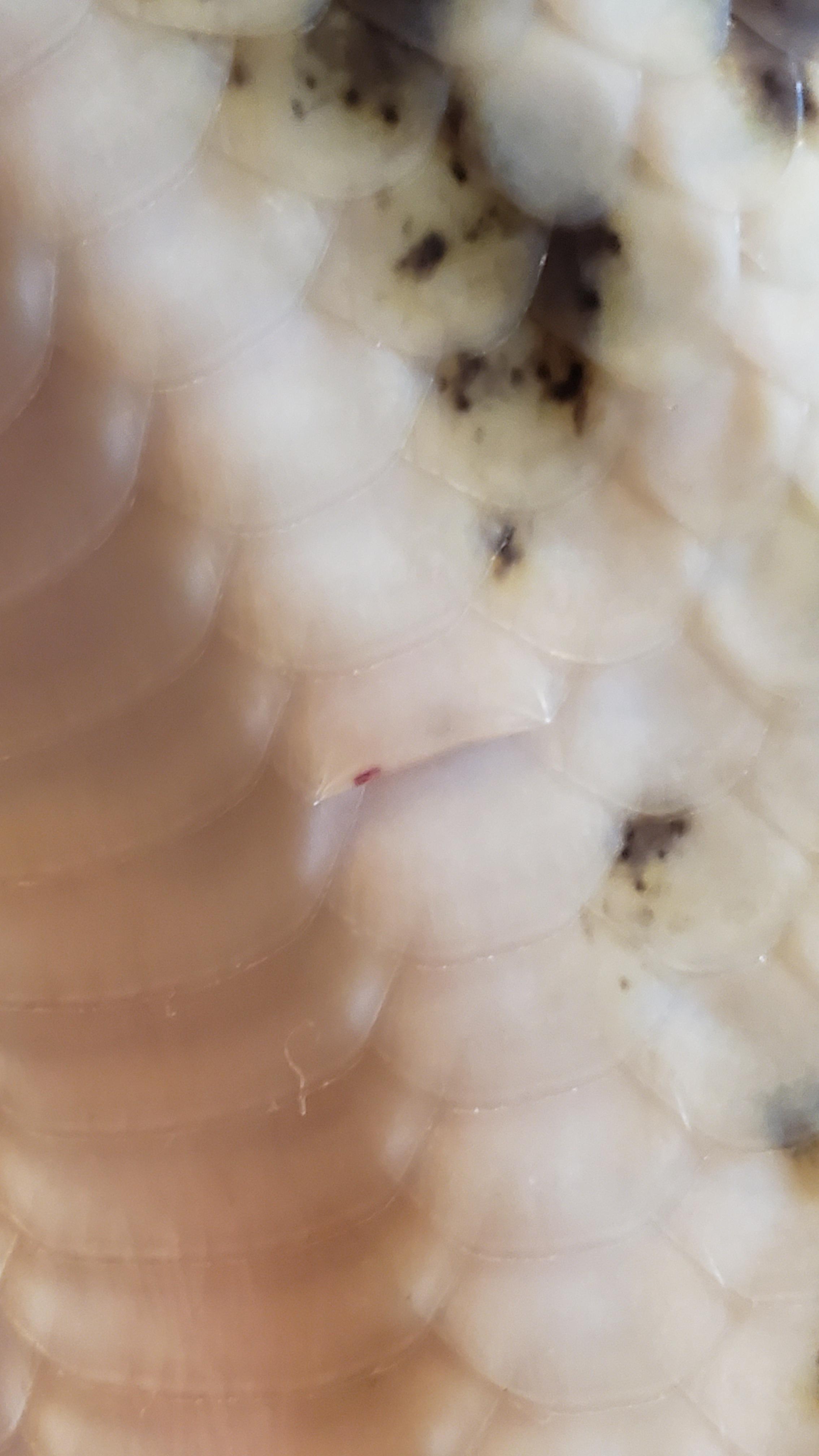 Anyway I noticed some strange looking scales on his belly when I was checking if it was pink. They almost look like they're folded over or cropped or something..? They're few and far between but he wasn't very happy with me (hissing while I was taking him out) so I didn't spend too much time looking at them. I caught a quick snap of what it looks like, and the one I got a pic of actually has red on it... I'm not sure if it's blood but it's kind of inside of the scale instead of outside of it. Most of the "weird" scales don't have this red.