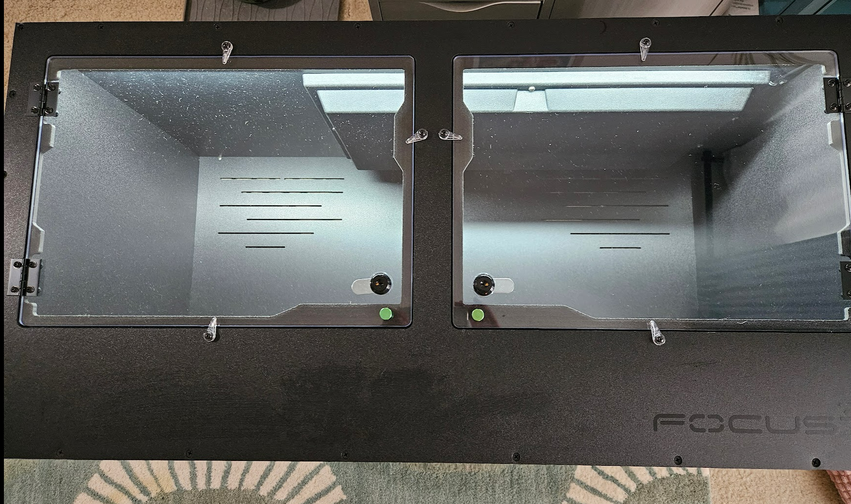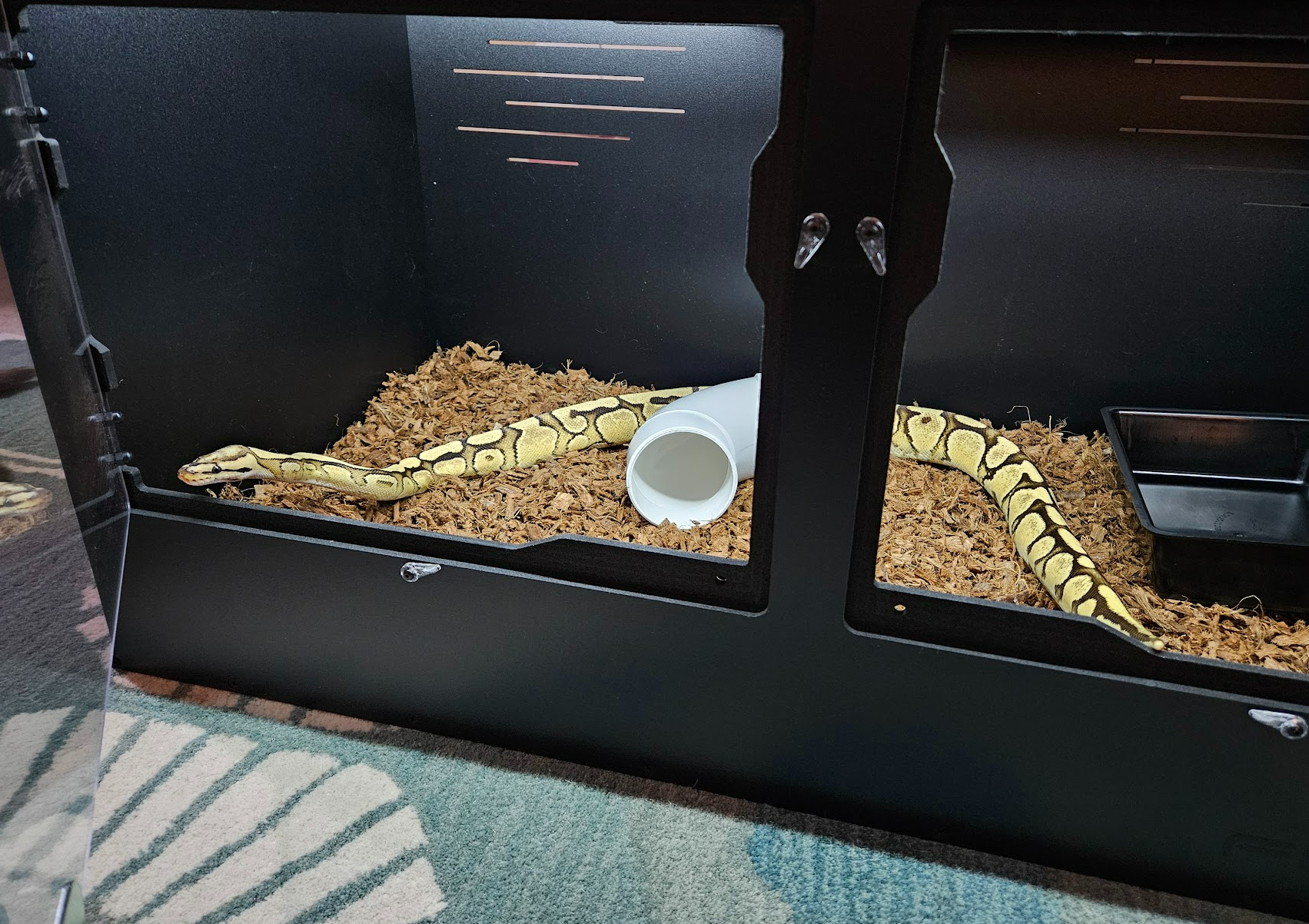 I ordered the Panorama 36" x 18" x 18" PVC enclosure from FocusCubed back in the summer - they estimated an 8 week lead time and it arrived exactly as predicted last month. Since they've been slammed with ordered I noticed they removed a lot of customization options since when I started browsing their enclosures - the paint for the outside was the first to go, and things like builtin shelves are no longer available. This makes total sense because they're trying to get things out quickly, so removing the visual stuff that doesn't benefit the snake but hurries things up seems very logical. I got the builtin LEDs (regular white, just for looking at the snake) and 80w RHP with installation, and locks for the doors. I went with the larger heat panel and shorter enclosure after seeing so many people talk about struggling to get the 24" tall enclosures warm down at substrate level - because BPs in general don't climb much and Clemmy in particular doesn't like to climb at all, it seems difficult to convince them to get up towards the heat in a taller enclosure. The parts were packed very tightly and carefully with styrafoam and reinforcements at the corners, and putting it all together was very easy - just needed one philip's head screwdriver. The RHP panel I ran on max for around 6 hours but honestly I didn't notice much of an off-gassing smell. The panels also only had a faint odor, though the styrafoam gave them enough static charge to immediately attract every dog hair in my house. I sealed the bottom with GE #1 silicone and let that dry for 24 hours, then put in substrate and let her check it out for a short session with the RHP turned off. After 2 more intro sessions with the panel turned on and tuned, I moved her into it with all her things. It was actually much easier than I expected! The only really annoying parts were trying to seal the front seam with silicone, since you can't see what you're doing, and actually moving the enclosure around after it's assembled - there's no handholds anywhere and I felt like if I opened the doors and grabbed it by the rims I might damage it. There is also no cushion between the doors and the PVC rims, so any tiny bump or truck going by and they rattle noisily. I live in earthquake country so small tremors also set the doors rattling - I'm planning to find some thin felt or something to put in there to reduce this, although it already seems less rattly now that it's not brand new out of the box and has maybe settled in some. Anyway it looks great, holds heat great, and the snake really seems to be enjoying it - she even comes out to bask under the heat at night (I put my hand in while testing it and wanted to climb in myself, it's a very comfy-feeling heat!). Looking forward to ordering the next size up as well!