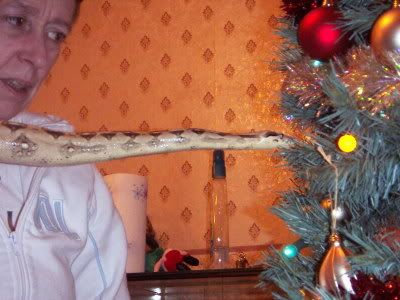 Here's one of our Boas, Zag, investigating the Christmas Tree. I was watching him carefully incase he tried to make a strike for the lights. Before I put the tree away for this year, when the lights are taken off, I'll let the snakes have a climb and get some pics. Make some great Christmas cards for next Christmas;)