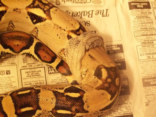 well, i told my friend who wants a snake really badly that nikita would be half hers if she wants. she cant keep snakes at all cause apartment doesnt allow it so i told her that she can have half of my snake. not literally but you get the idea. her name is linda and mine is lenny so she insisted that nikitas name be changed to "linny" haha. i reluctantly gave in even tho i love the name nikita. so the next female boa i get will be nikita. haha anyways, "linny" was shedding so i snapped a few pics.