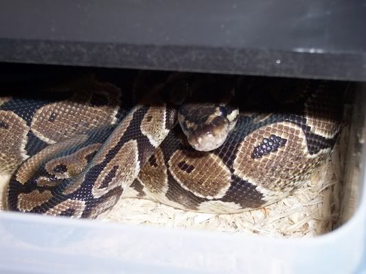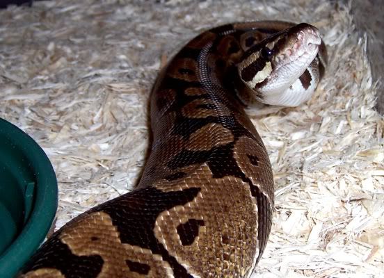And a treat! This morning I received my new adult female from Jennier and Dustin at diapsid. She weighed 1100 grams out of the snake bag, and was quite curious and tame. Here's a bunch of snapshots of her...I love the pattern on her. Oh, and the kicker, bought her as a normal but she's 50% het for albino...so hopefully she'll prove out one day. She's settling into her new tub nicely, roaming around and checking things out.
