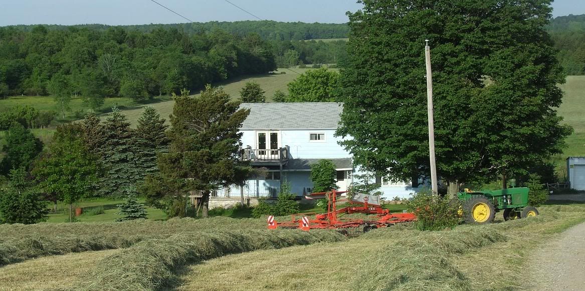 Here's mine! We are renting the farm (our landlord retains a small apartment upstairs but is there roughly one weekend a month.) There's a farmer who we buy hay from that rents the fields around the house for haying. Here's the view as it was last week: