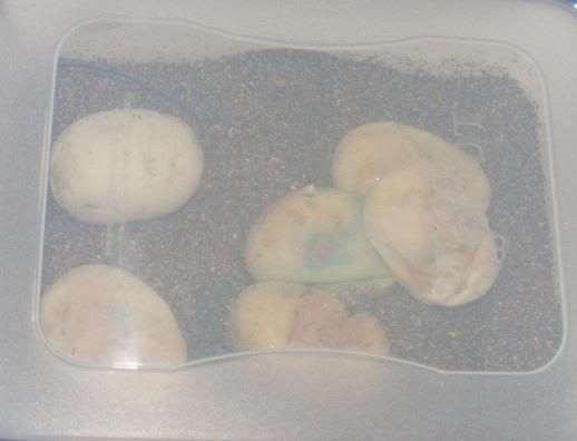 See, I thought that the verm was too dry. It does not feel like you can wring it out or anything. I know why the eggs look so moist though; condensation was/is forming on the dead eggs, and the one that you can see in the bottom-right in the first pic, actually has a pool of liquid on one of its dents.. not sure if maybe it got a small hole, or if it is just from it being rotten. This is definately not from condensation in the tub, because the inner lid is bone-dry; this was my first thought, but no water has dripped from the tub lid to the eggs. I have decided to throw them out and keep the one that still looks good. This is a tough choice but I am not going to be incubating dead eggs thinking they will live. :(