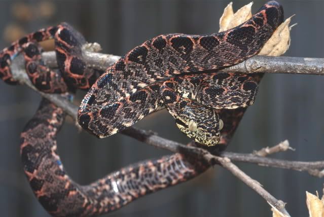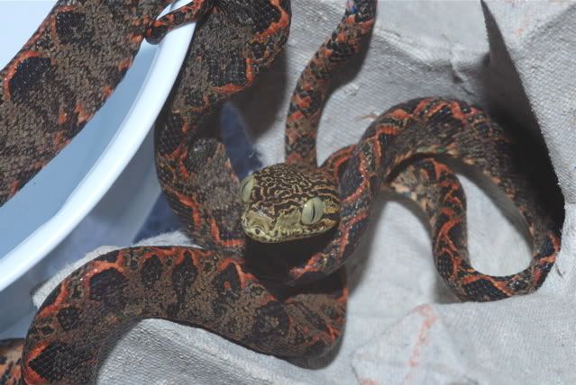 -'07 male Green Pampas Rat Snake....very unique snake....behaves kind of like a Green Snake, but eats frozen/thawed fuzzy mice! Kind of flighty once you get him out, but calms down quickly....does not bite at all.....don't see many of these available.....asking $350.