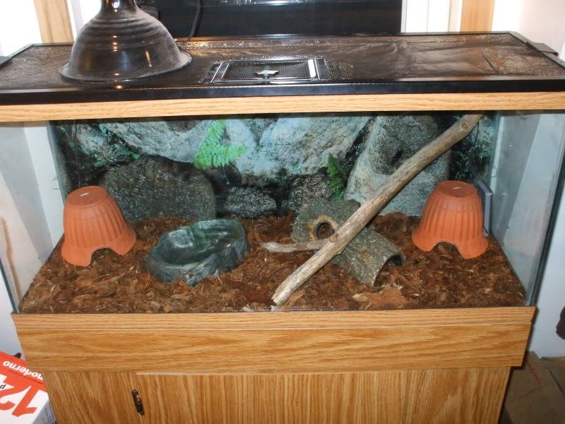 I recently moved "Spot" into his new and hopefully lifelong enclosure from the ten gallon tank that we had him in. While it's probably a touch early to move him to a bigger tank I think with enough hides and greenery (Once I get to Walmart tomorrow) he should do great. So far the temps are spot on where they should be, 92 on the hot 80 on the cold and about 82 ambient.