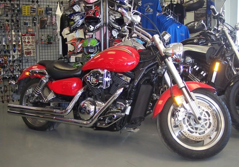 Just had to put a pic of my bike up. The pic was takin at my uncle's shop when I had it for sell. It is an 03 kawasaki Meanstreak. Sometimes ride it to work. Mostly ride on my days off. It is a blast to ride, very fast, and good throttle response!