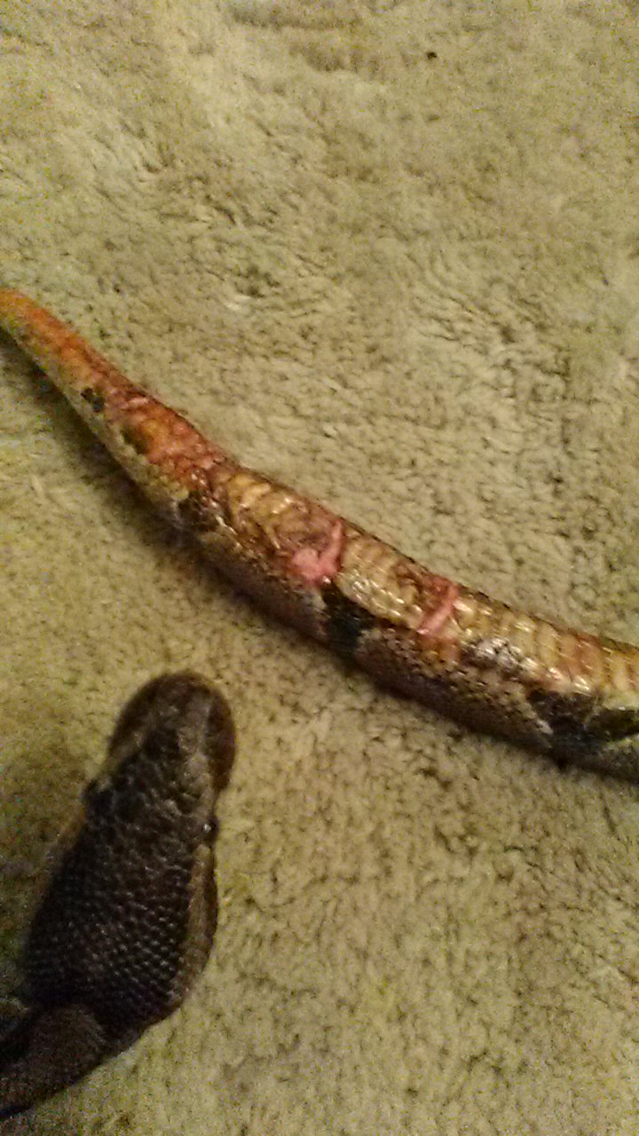 How long has this been going on to let it get that bad? He's about four feet long and it goes halfway down his body to the very tip of his tail. Two whole feet of him is like this. Once I show my friend, she wonders if it was the heat pads which have burned him before. Yes, but those were minor burns that only reddened his undersides. That could be one of the causes but only one. It's not alone. Arthur, her step dad, comes downstairs in the basement where he keeps his snakes and he sees this. Does he looks surprised? Yes. Ariana, my friend, asks the question I wanted to know. "Does he need to go to a vet?"