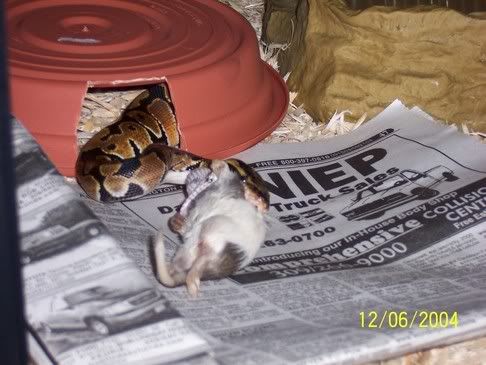 He just ate! I got some great pics too!! :D I've found out that it has to be pretty warm for him to be interested in it. Before it would be warm enough but by the time he got done "killing" it the temp had dropped and he didn't want it anymore. This time I got it up to about 100 degrees and made it "dance" and he pounced on it after about 30 seconds. Then he held it for a couple of minutes then ate it. I guess it just wasn't staying warm enough for him.