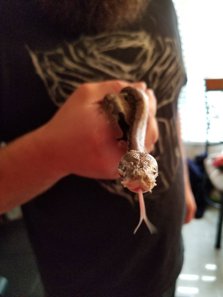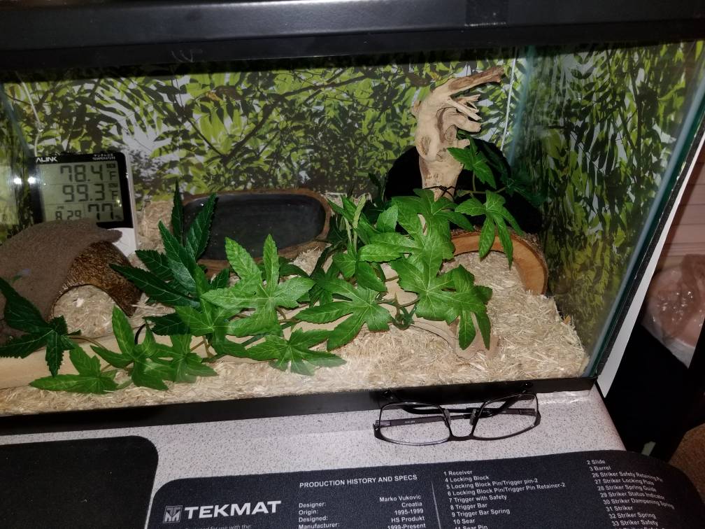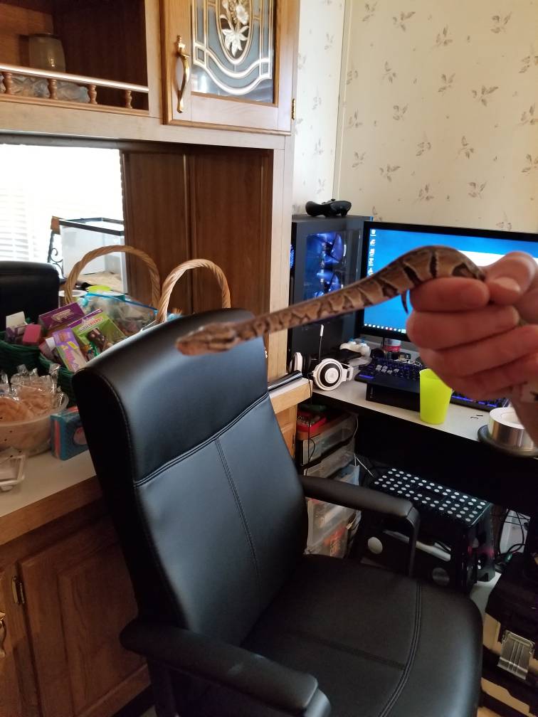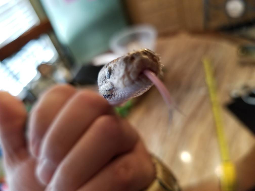I expected trouble for sure but was so happy she didn't care. She has always ate immediately, even when shedding. But since I started offering her the right size prey every 4-5 days, she runs off to her hot hide and we won't see her again till next feed or when I get her out. Before during the first 3-4 weeks she was always out climbing on everything poking around the top lid and getting wrapped around the temp cords. Eventually I hot glued them in place and got her feeding back on track. She is still calm as ever and never struck out in defense or been in a defensive position from what I can tell.