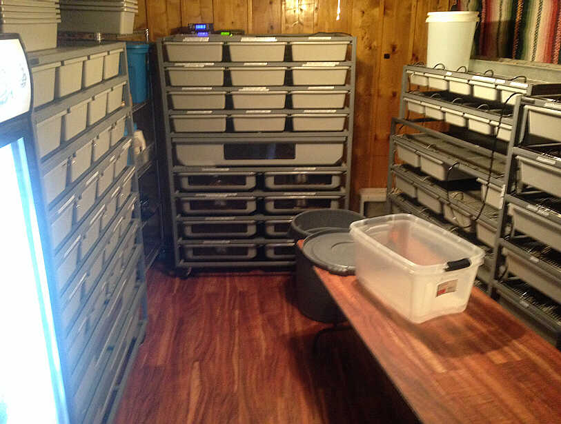 The rack in front and to the left are filled with nearly 50 snakes, some I'm growing out and some are for sale but most are breeders. Right now I have room for about six more snakes! To the left of that is my incubator (beverage cooler conversion).