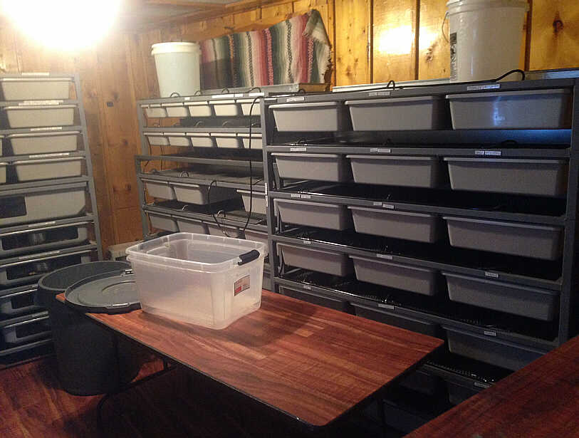 If you go with nice ARS racks like I have above you won't have to worry about chew outs and rats running all over your house, which is one of the main reasons I invested in a professional rack instead of building my own. Also, there is really no daily maintenance besides filing up the water pail on top. One rack holds 150-200 pounds of feed, I just top off the food twice a week during cleaning day. Takes about one hour to clean one rack, so two hours mid week and two hours on the weekend. So much less work than tubs or aquariums!