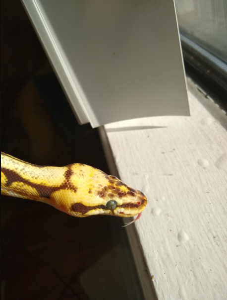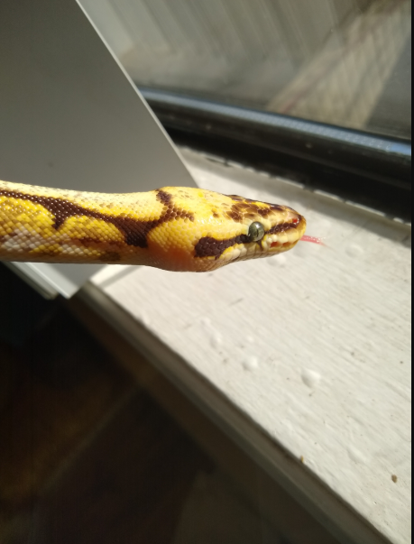 The sun is out today, so I got Rei out for some photos. Only natural light really does her justice. Still too cold outside for snakes, but I do have a window. I got some really nice headshots of her today, and finally captured the true color of her eyes. I'm also amazed at how good photos my phone takes.